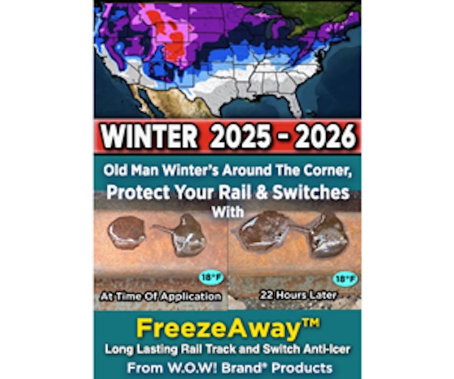 Old Man Winter’s Around The Corner, Protect Your Rail & Switches With FreezeAway™ Anti-Icing Compound Provided in 18.9 L( 5 US gal), 205 L (55 US gal drums). 1000 L(275 US Gal totes), 1300 L(330 US Gal totes), and bulk tanker. Produced in North America. Readily Biodegradable. Works down to and below -27C(-16 F).